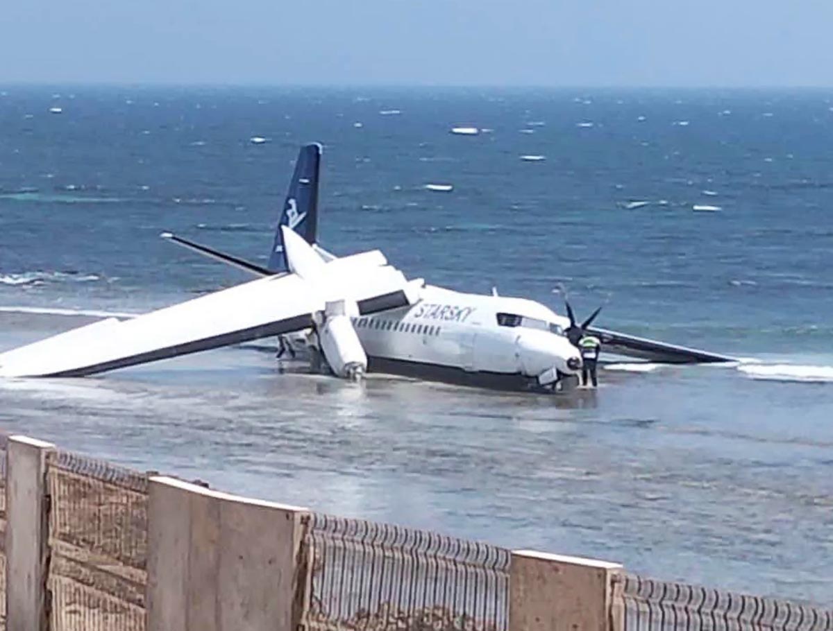 MOGADISHU, Somalia — A StarSky Aviation Fokker 50 crashed on the shoreline of the Indian Ocean early Tuesday afternoon shortly after departing from Aden Adde International Airport (MGQ).