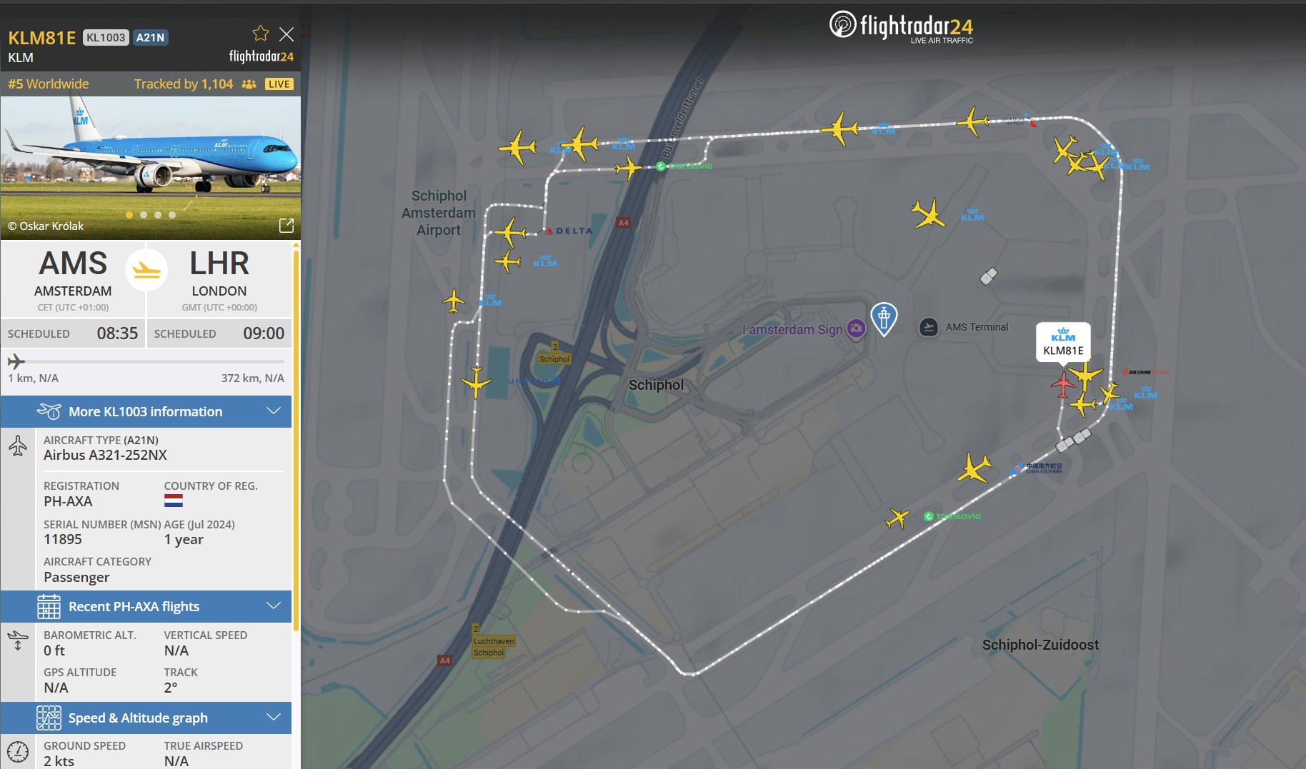 KLM aircraft to London circled Schiphol Airport twice on taxiway before the flight was cancelled