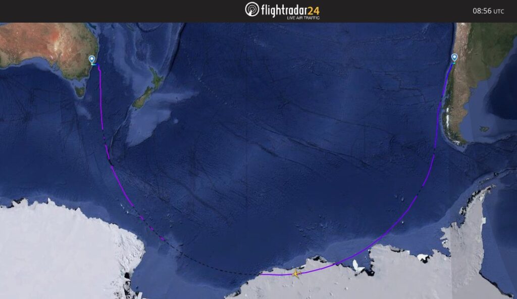 While many transoceanic flights stick to the edges of continents, Qantas flight QF28 (Santiago to Sydney) is famous for taking the “Great Circle” route. Because the Earth is a sphere, the shortest path between South America and Australia often requires dipping significantly toward the South Pole.