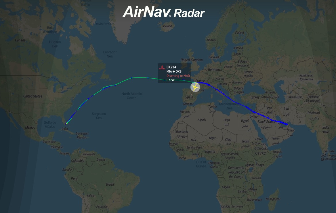 MADRID – An Emirates Boeing 777-300ER traveling from Miami to Dubai was forced to declare an emergency and divert to Spain while cruising over European airspace early Saturday afternoon.