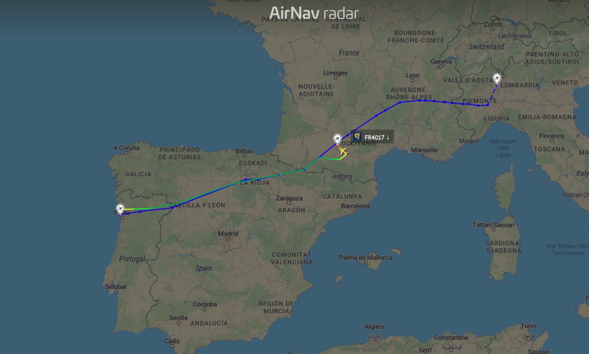 TOULOUSE, France – Flight FR4017, operated by a Boeing 737-800 (registration 9H-QEP), departed Porto (OPO) at 13:32 WEST. The aircraft had reached its initial cruising altitude of 34,000 feet while overflying Spain when the situation developed.