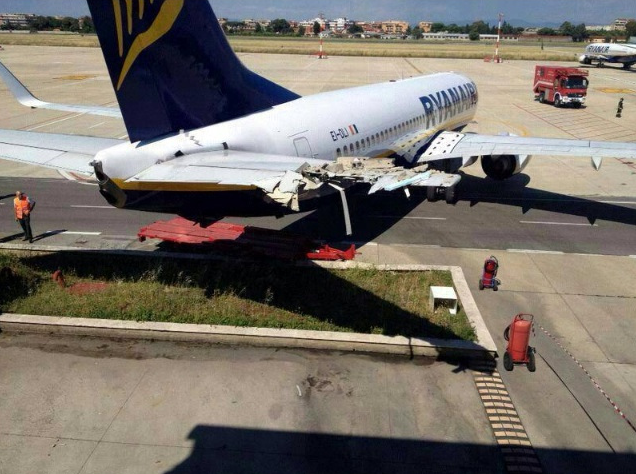 Reports are unclear but a report is saying that the aircraft rolled into an adjacent building causing significant damage to the horizontal stabiliser.
