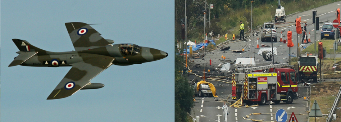 A Canfield Hunter Limited Hawker Hunter T7 (G-BXFI) crashed during a display at the Shoreham Airshow at Shoreham Airport, England. The aircraft failed to complete a loop manoeuvre & crashed onto vehicles on the A27 truck road, West Sussex. Killing 11 people on the ground including 2 players from Worthing United Football Club. The pilot survived the crash and was placed in a medically-induced coma. Later recovered. It was the deadliest air show accident in the United Kingdom since the 1952 Farnborough air show crash, which killed 31 people.