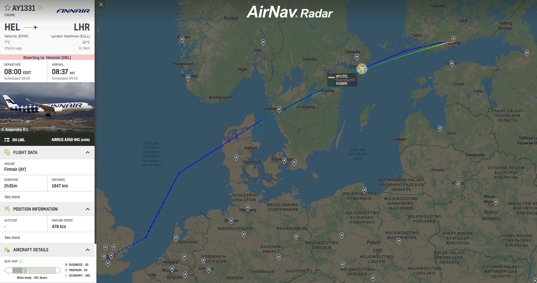 Finnair flight AY1331 to London has turned around over Denmark