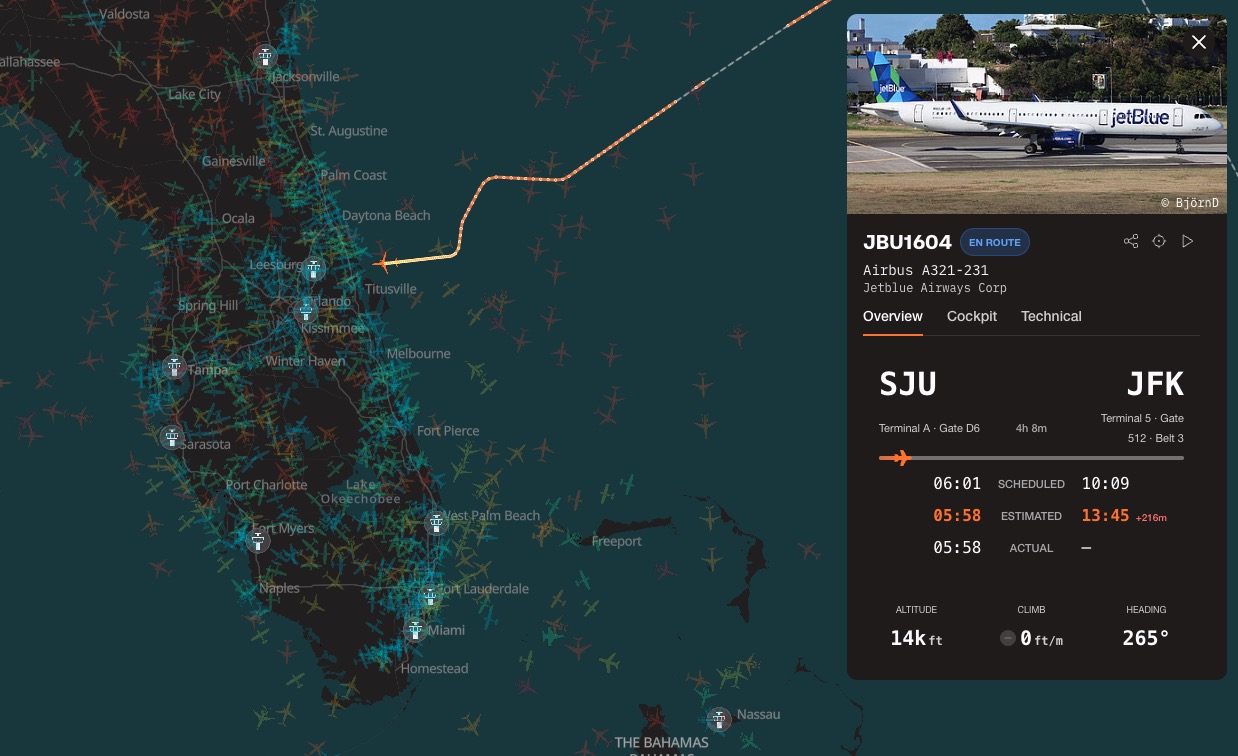 ORLANDO, FL — JetBlue Flight B61604, operated by an Airbus A321-200 (registration N913JB), departed San Juan, Puerto Rico, at approximately 6:00 AM AST. The flight was tracking normally toward New York when, while cruising at 32,000 feet, the flight crew initiated an abrupt turn to the west toward the Florida coast.