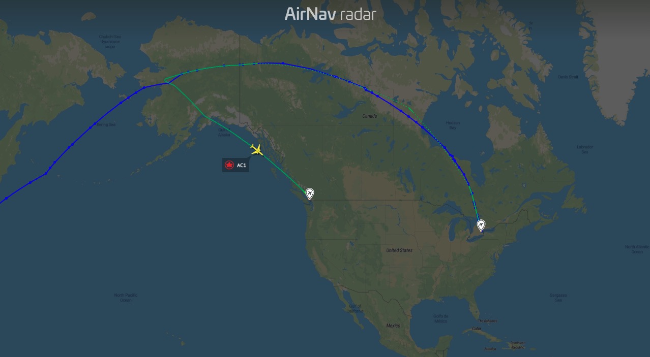 VANCOUVER, BC – The flight AC1, operated by a Boeing 777-300ER (registration C-FIVS), departed Toronto Pearson International Airport at 1:05 PM. After climbing to a cruising altitude of 32,000 feet then 34,000 feet and traversing Northern Canada, the aircraft was positioned over the Alaska-Yukon border when the crew declared a diversion.